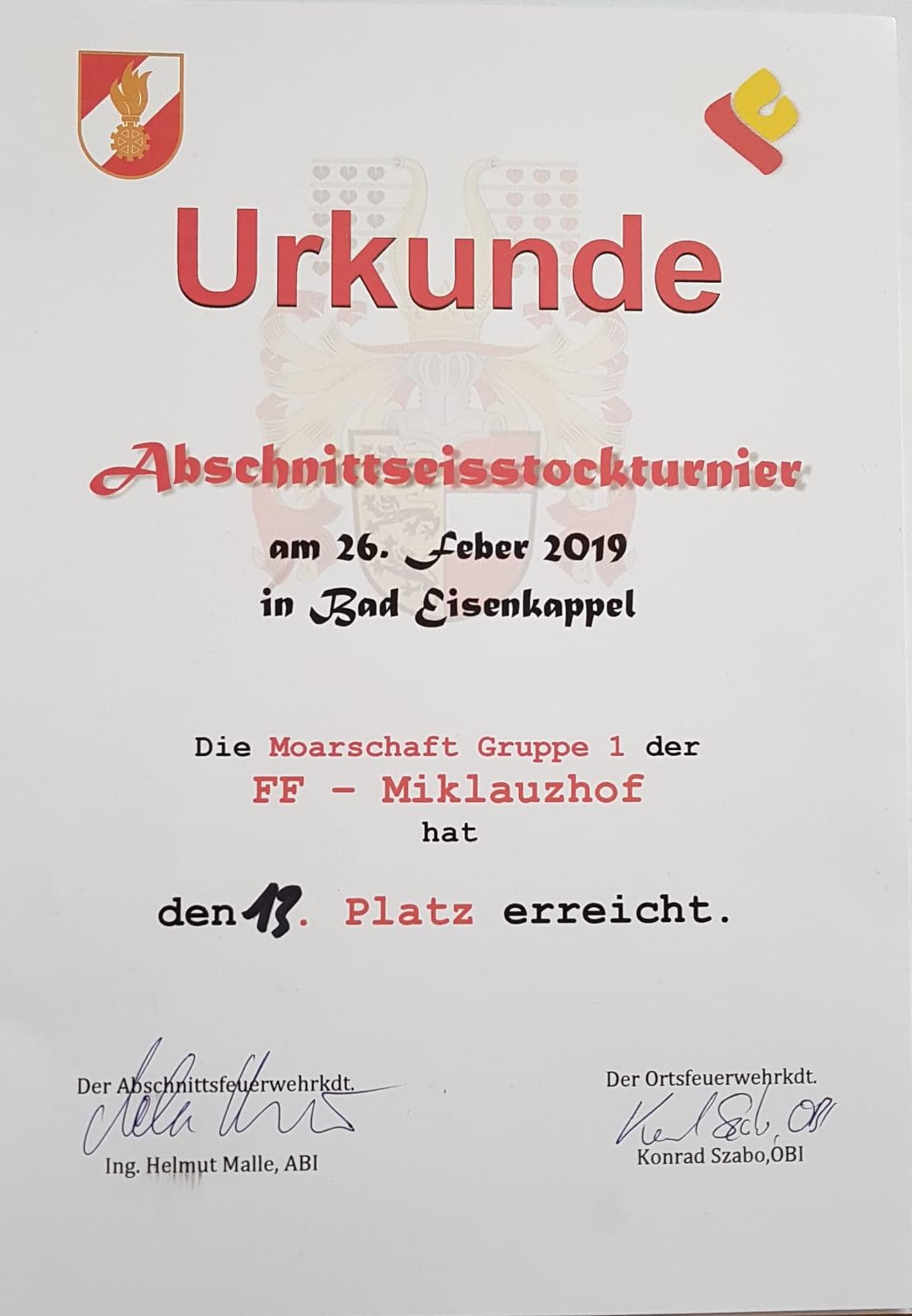 Am 26.01.2019 nahm eine Moorschaft der Freiwilligen Feuerwehr Miklauzhof am Abschnitts- Eisstockturnier der Freiwilligen Feuerwehr Bad Eisenkappel teil.